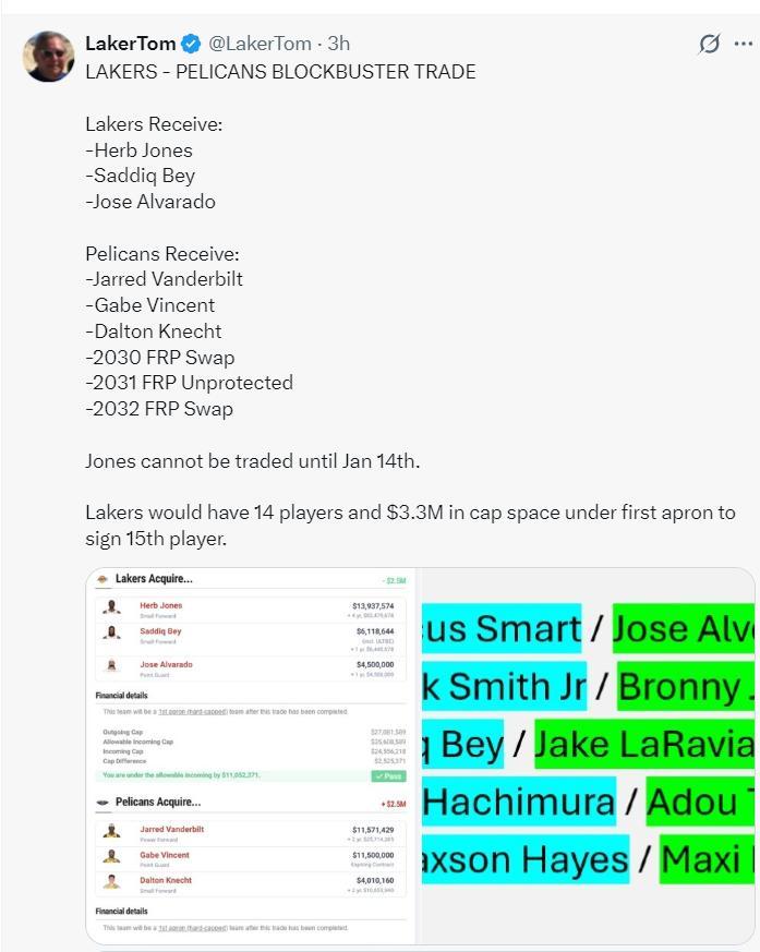 湖人媒體laker Tom爲湖人模擬了一套大交易方案,他認爲湖人不該只交易赫伯特-瓊斯一人,湖人應該藉此機會擴大交易進行超級補強。