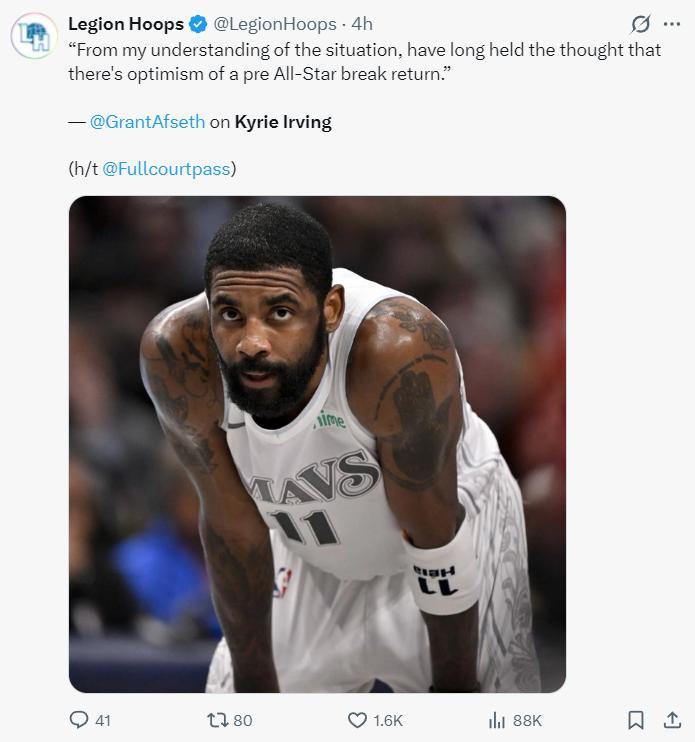 賽後獨行俠隊記Grant Afseth透露,凱利-歐文有希望在一個月或一個半月後復出,獨行俠內部對他在全明星賽後復出持樂觀態度,歐文本人也想證明自己傷愈後依舊是頂級球員,他甚至渴望挑戰極限,比如比預期更早的迴歸賽場,歐文一直在全力以赴提前復出。