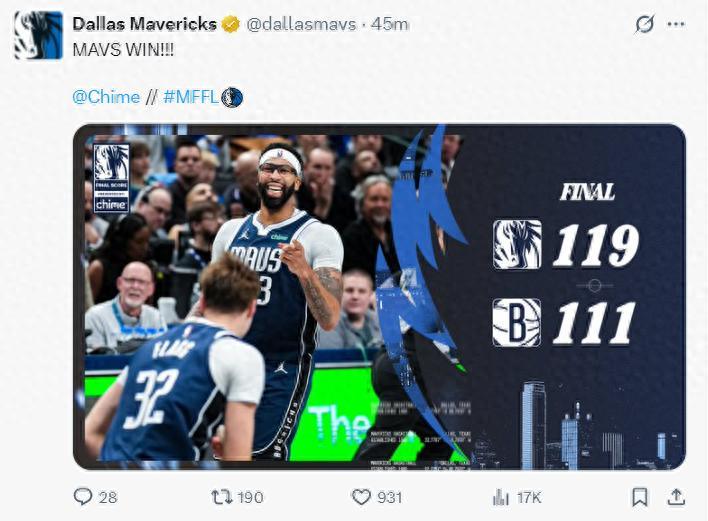 達拉斯獨行俠119-111險勝籃網拿到二連勝,最近的6場比賽他們贏下了其中的5場,而獨行俠的改變是從瑞安-內姆布哈德登上先發陣容才改變的,獨行俠用了兩場比賽來適應全新的陣容,換言之最近8場比賽贏下5場跟內少先發有着千絲萬縷的關係。
