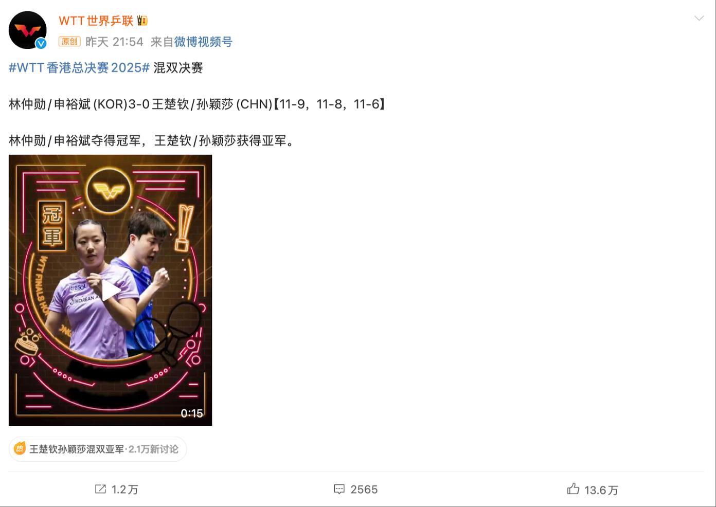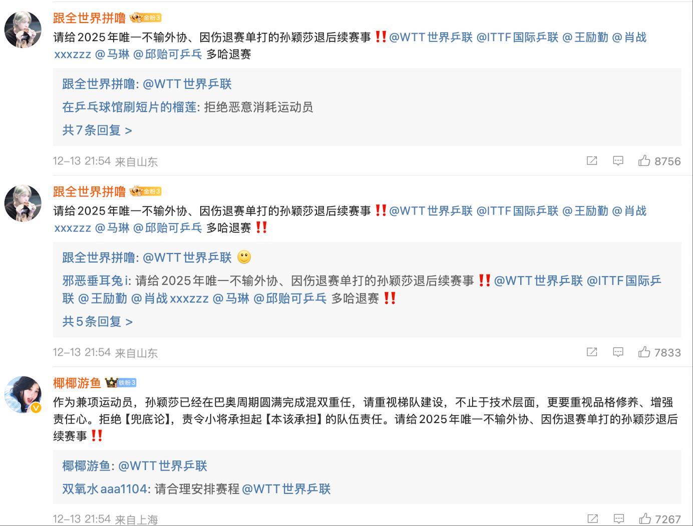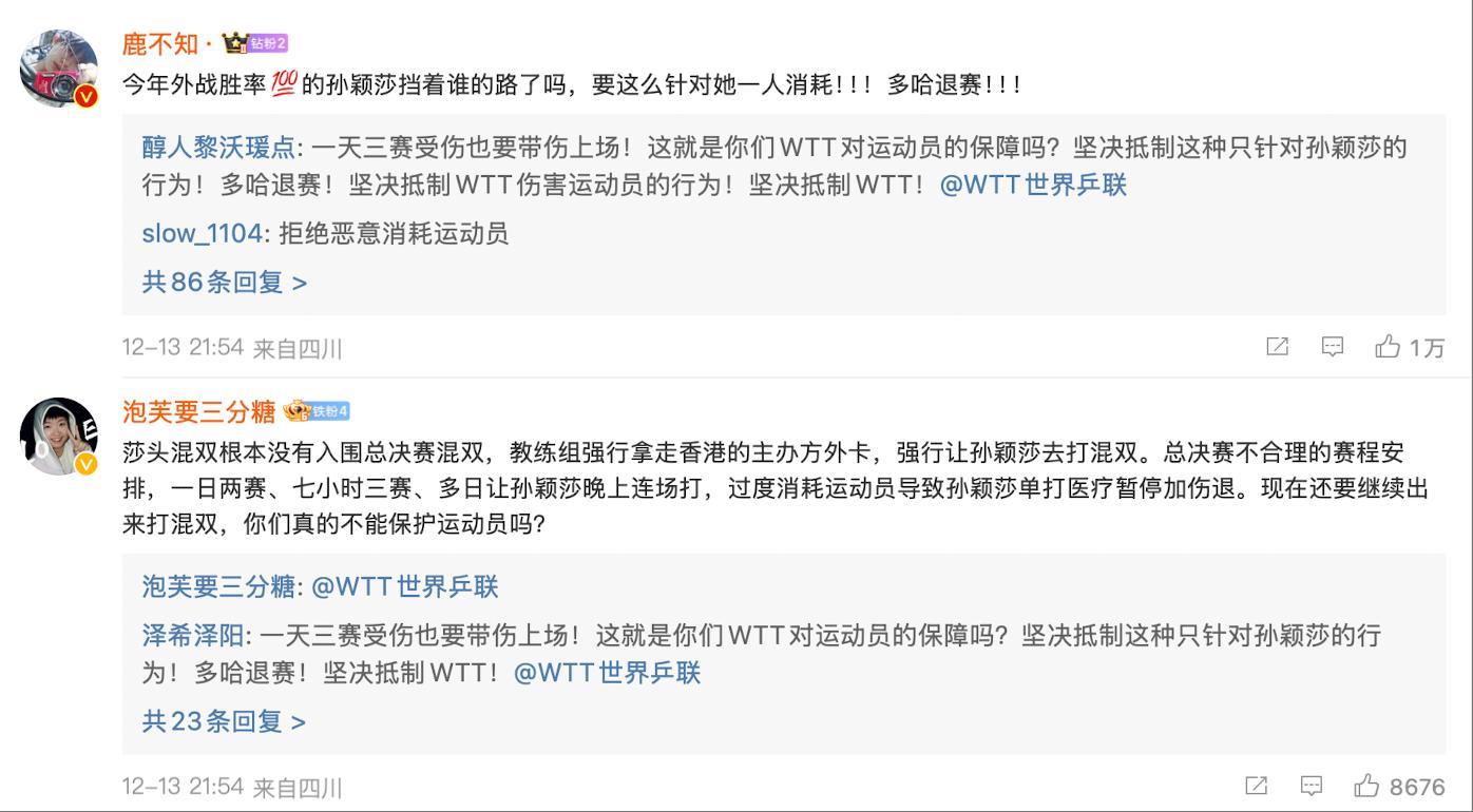 WTT官方祝賀林鐘勳/申裕斌奪冠的推文下方,孫穎莎的粉絲們直接攻陷了WTT的官推,無數的球迷對wtt的賽程安排/惡意給莎頭混雙外卡感到不滿。