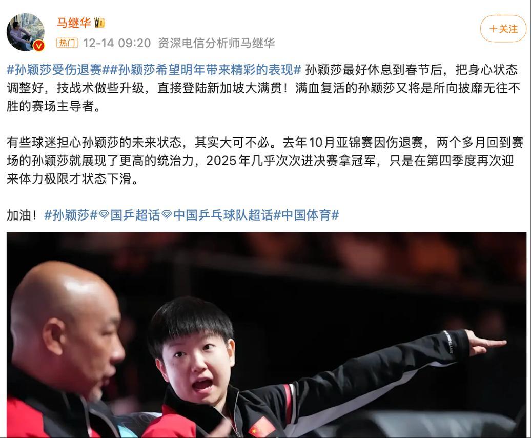 馬繼華建議孫穎莎進入長時間的休養期,直接休息到春節之後,這樣讓身體恢復到100%直接登陸新加坡大滿貫,去年10月亞錦賽傷退後,孫穎莎休養兩個多月迴歸立馬就制霸了賽場。