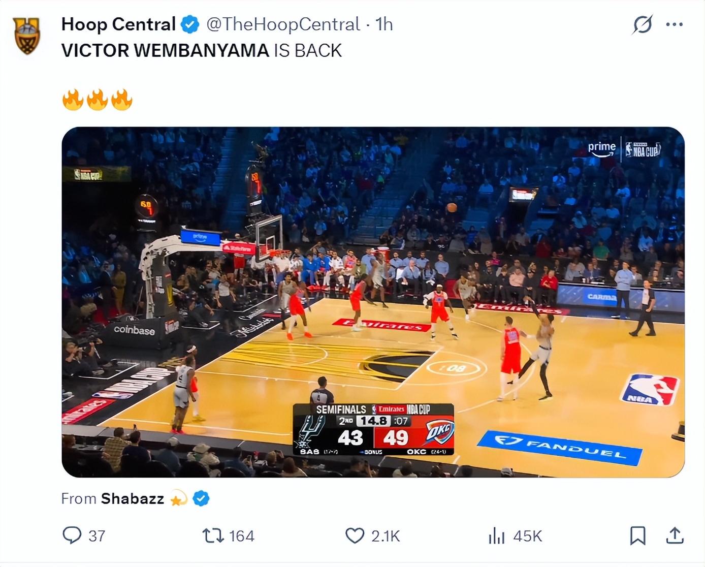 北京時間12月14日,聖安東尼奧馬刺隊迎來了維克托-文班亞馬的復出,他自11月17日後傷停至今已經過去了27天之久,也因爲他的傷情此役他有登場時間限制,上半場僅打7分,全場比賽也只打了21分鐘不到(20分39秒),可他無比強大的比賽影響力幫助馬刺爆冷擊敗了聯盟第一的雷霆,OKC吞下賽季第二場失利。