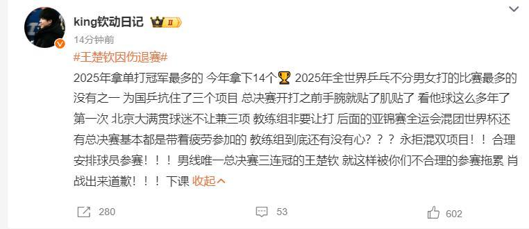 很多的球迷都覺得王楚欽選擇退賽是對的,有了傷病就該保護自己,剛剛打完混團世界盃又來總決賽兼項,莎頭兩人都太累了,王楚欽該好好休息。