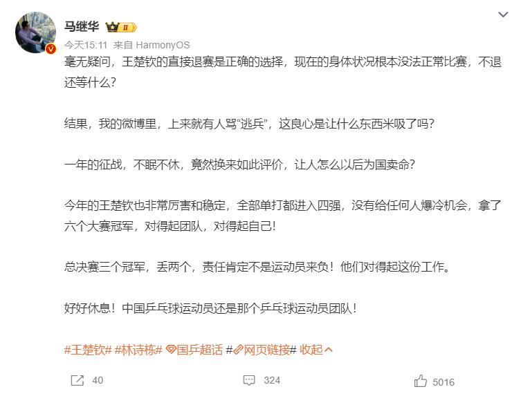 馬繼華老師認爲王楚欽直接退賽的選擇是正確的,王楚欽此前就說過‘身體已經到達極限’,這種情況根本無法正常比賽。王楚欽今年已經非常穩定,每一站都打入四強沒有給任何人爆冷的機會,他已經對得起團隊,對得起自己。