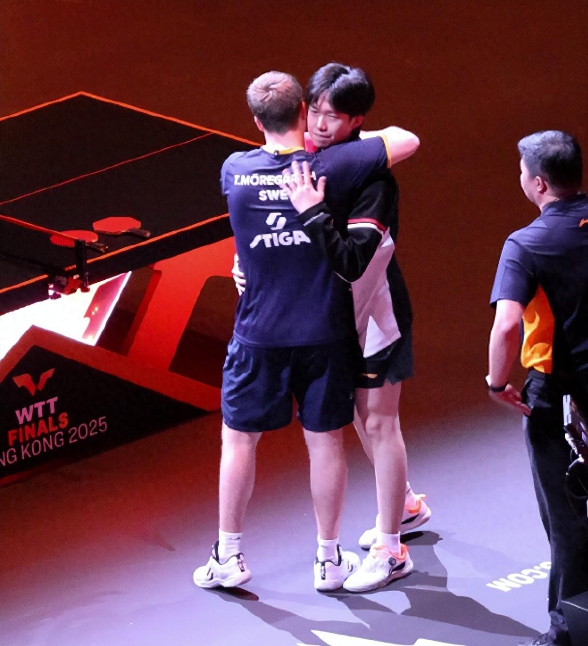 在林詩棟3-4惜敗張本智和後,王楚欽立馬就宣佈因傷退賽,今年香港總決賽男單決賽:莫雷加德VS張本智和,小莫也爲王楚欽獻上了一個擁抱,不足24小時內孫穎莎/王楚欽兩位單打世界第一退賽,這引發了熱議。