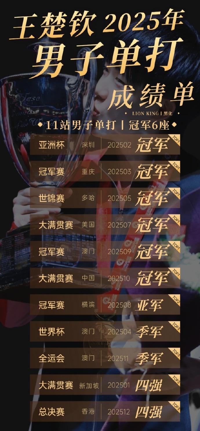 王楚欽整個2025賽季單打就出戰了11站賽事,這11站他全部進入四強,而且拿到了6個冠軍、1個亞軍、2個季軍,王楚欽真的已經非常出色。