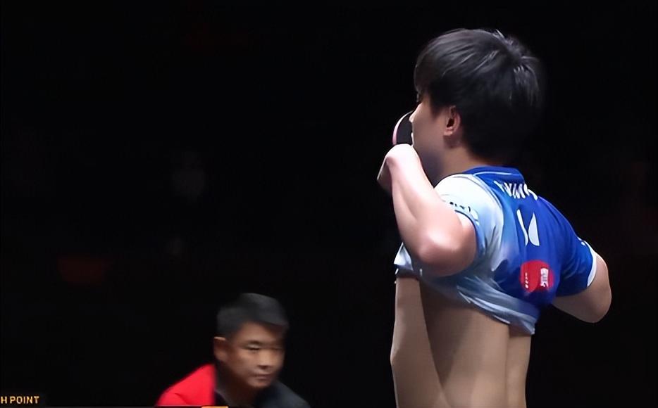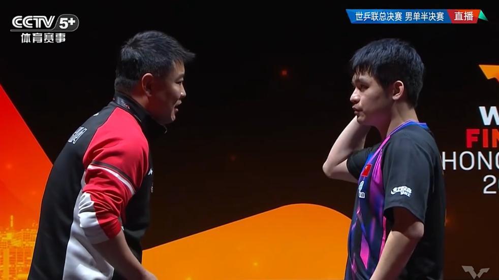 張本智和轉身接受球迷的歡呼時,王皓指導有一個抿嘴的動作,他肯定將所有的希望都寄託在林詩棟身上,因爲王楚欽的退賽是一早決定好的,林詩棟輸球就等於國乒無緣總決賽冠軍了。
