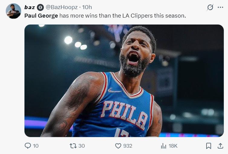 費城球迷還扎心快船,本賽季喬治的勝場數比快船的勝場數要多!快船目前只有6勝,而費城已經14勝。