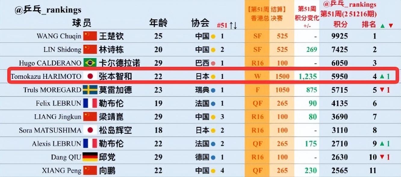 總決賽單打選手有1500積分,張本智和+1235,總積分來到5950,他的世界排名超過了莫雷加德升至第四位,張本智和總決賽前是世界排名第五,拿到這個冠軍對他來說很重要。