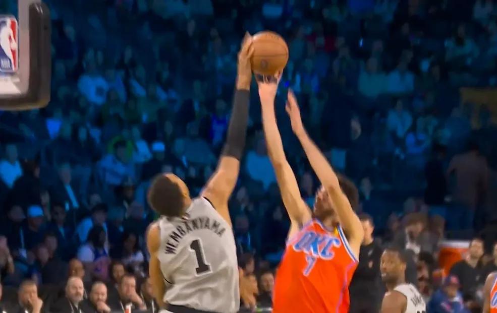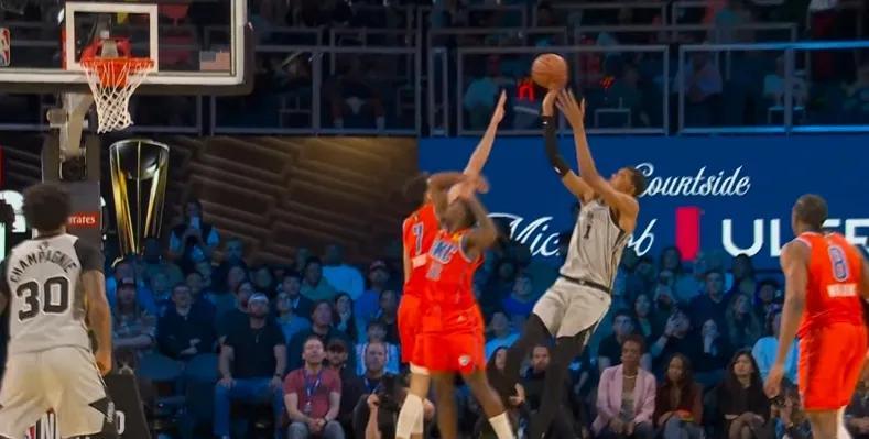 雷霆排出了他們的防守悍將卡魯索與外星人對位,其實收到過階段性效果,但不妨礙文班一一破解,漂移中投被推腰 依舊無解轟進。