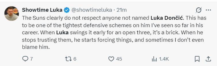 但東契奇的球迷這樣評價:太陽隊顯然對除盧卡-東契奇之外的任何球員都不屑一顧。這可能是我職業生涯中見過針對他的最嚴密的防守策略之一。誰東契奇爲隊友創造空位後對方總能封蓋成功,東契奇不再信任隊友自己強攻,所以命中率不高,我一點都不怪他。