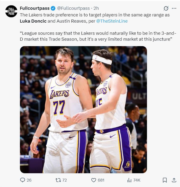 賽前根據NBA記者馬克-斯坦恩的報道,洛杉磯湖人隊沒有興趣交易東契奇、裏夫斯,球隊會圍繞這兩位後場建隊,他們正在努力找尋跟這兩人的年齡匹配的3D側翼球員。