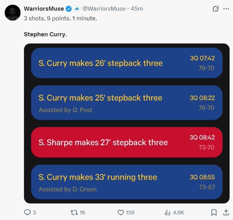 第三節庫裏在8分55-7分42秒這1分多鐘裏連續命中三個三分球,你們沒有看錯,就是連續三個三分球拿到9分,1分鐘拿9分,第三節他單節三分6中4拿到12分2助攻1籃板1助攻。