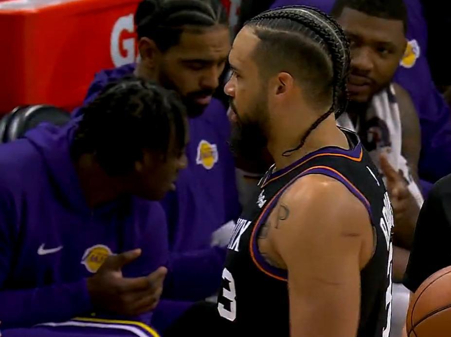 第三節開場狄龍與詹姆斯就產生衝突,狄龍疑似不滿詹姆斯的動作將球砸向老詹,結果裁判給了詹姆斯一個T,詹姆斯非常憤怒。布克三分打鐵,詹姆斯接球沒接穩失誤,詹姆斯翻身跳投單打阿倫還是未能命中,東契奇三分繼續打鐵,湖人三分太鐵了好在伊戈達羅拉人犯規,太陽反擊不中,東契奇打吉萊斯皮造犯規,海斯暴扣2+1反超了,文森特三分準壓哨,太陽五分鐘沒得分被湖人反超九分。