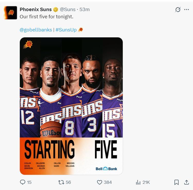 布克傷停了三場比賽後復出,杰倫-格林還在傷病名單上,太陽先發是1大4小。