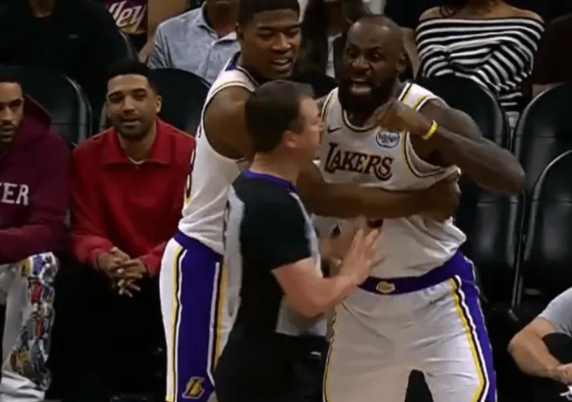 第三節比賽中,狄龍將球扔向詹姆斯,後者憤怒追要說法,裁判吹罰詹姆斯技犯,詹姆斯非常憤怒,八寸壘抱着詹姆斯,感覺老詹第一次想幹裁判。