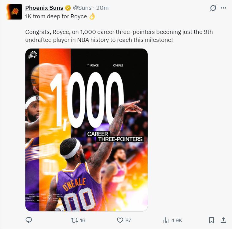 羅伊斯-奧尼爾生涯完成1000+三分里程碑,他成爲NBA歷史第九位落選秀達成1000+三分的球員。
