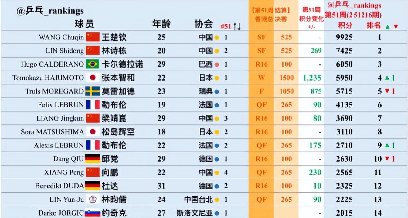 雖然王楚欽只打入四強,但他沒有減少積分,目前還是9925分,他依舊是世界第一。