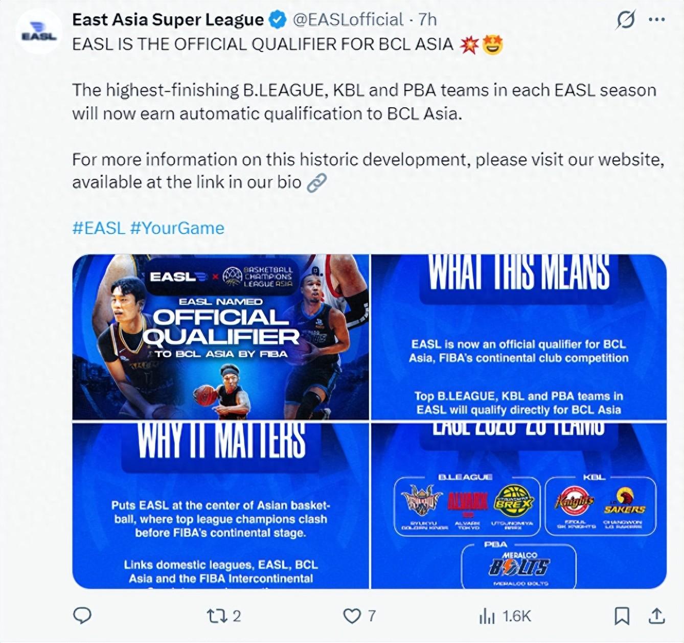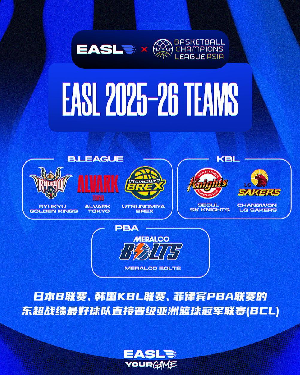 北京時間12月15日,EASL(東亞超級聯賽,簡稱:東超)官方宣佈:EASL成爲BCL(亞洲籃球冠軍聯賽)亞洲區的官方資格賽,日本B聯賽、韓國KBL聯賽、菲律賓PBA聯賽中在東超排名最高的球隊自動獲得BCL亞冠的參賽資格。