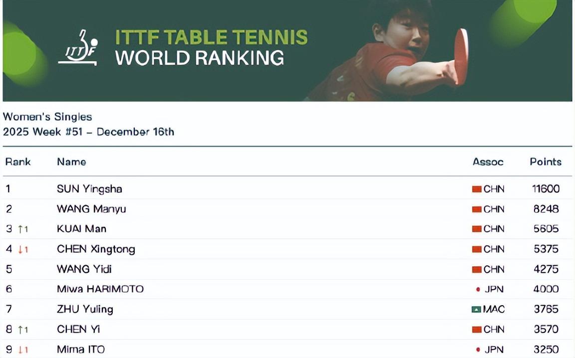 12月16日WTT公佈了2025年第51周的世界排名,孫穎莎11600分繼續世界第一,她已經連續179周蟬聯世界第一,她已經創造了世界排名系統出臺後的全新紀錄。