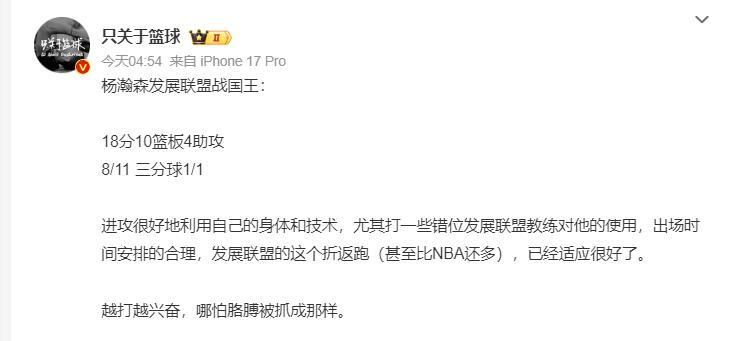國內的博主也認爲,楊瀚森進攻端可以很好的利用自己的身體與技術,發展聯盟教練對他的使用也很合理。