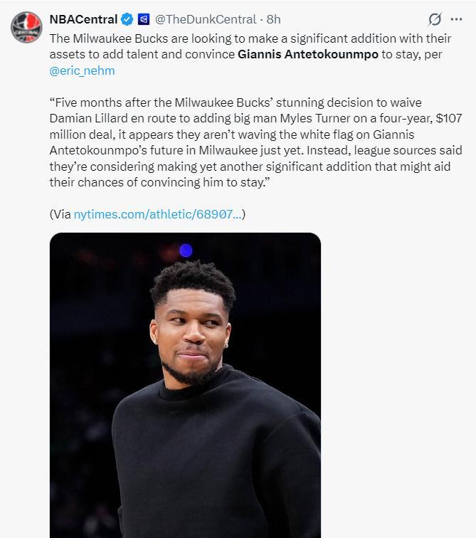 根據TA的報道,雄鹿隊在交易得到特納後球隊就一直致力於幫助揚尼斯組建一套心儀的衝冠陣容,在新賽季開局不佳的情況下雄鹿隊正在努力交易得到一位球星,希望交易達成後能增加揚尼斯留隊的概率。