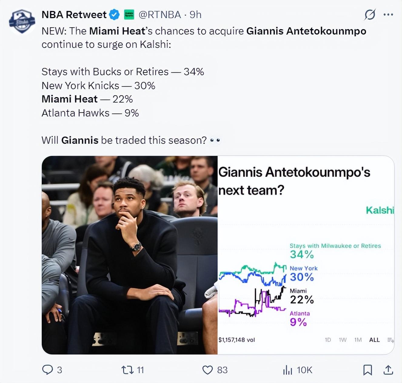 根據數據媒體的預測,熱火隊得到揚尼斯的概率依舊是聯盟較高的存在,雄鹿34%、尼克斯30%、熱火22%,最新的消息是揚尼斯已經闢謠了那些他申請交易的流言。