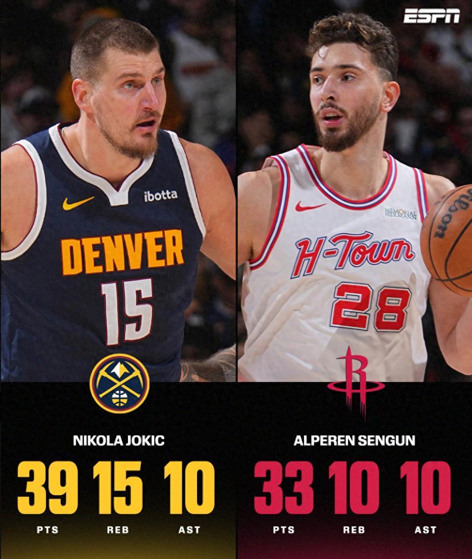 火箭3分惜敗掘金,約基奇鏖戰43分鐘拿到39分15籃板10助攻2搶斷2蓋帽,申京鏖戰42分鐘拿到33分10籃板10助攻2搶斷1蓋帽,兩位聯盟最頂級的中鋒都拿到30+三雙的數據,但賽後卻沒有人討論數據。