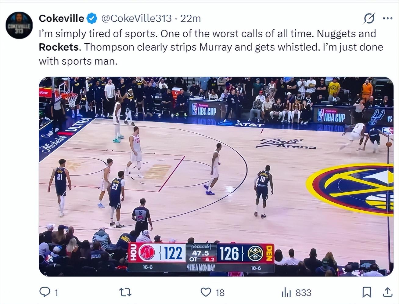 美媒Cokeville曬出了阿門搶斷穆雷的一幕,這個球就是裁判吹罰犯規送穆雷兩罰那個球,他寫道:我對體育已經失望了,這是有史以來最糟糕的吹罰之一,阿門明顯搶斷成功,但裁判卻吹了犯規。我對這項運動已經失去了興趣,再也不想看了。
