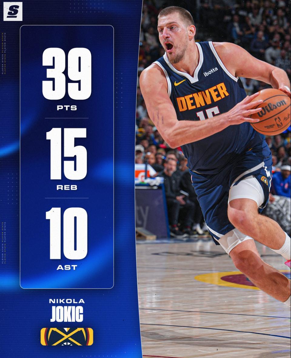 加時賽掘金助攻瓊斯三分命中完成30+三雙的數據,隨後約基奇喫到第六次犯規下場,可下場後火箭阿門開始表演臥底幫助掘金取勝。約基奇全場比賽42分鐘,27中13,三分9中5,拿到39分15籃板10助攻2搶斷2蓋帽,命中率48.1%。