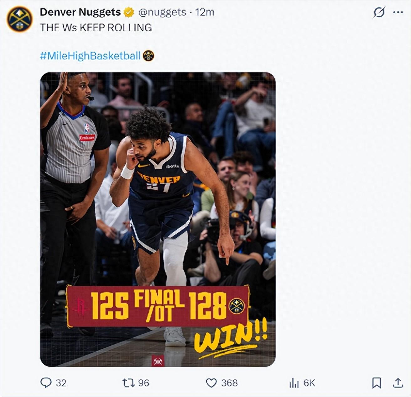北京時間12月16日,NBA常規賽,掘金以128-125鏖戰加時賽擊敗火箭完成五連勝。這場比賽尼古拉約基奇的表現已經非常出色,常規賽時間險些完成三分絕殺,加時賽被吹6犯下場,但火箭的阿門-湯普森腦袋發熱連續犯錯幫助掘金拿下勝利,約基奇笑納勝利與39+15+10的數據。