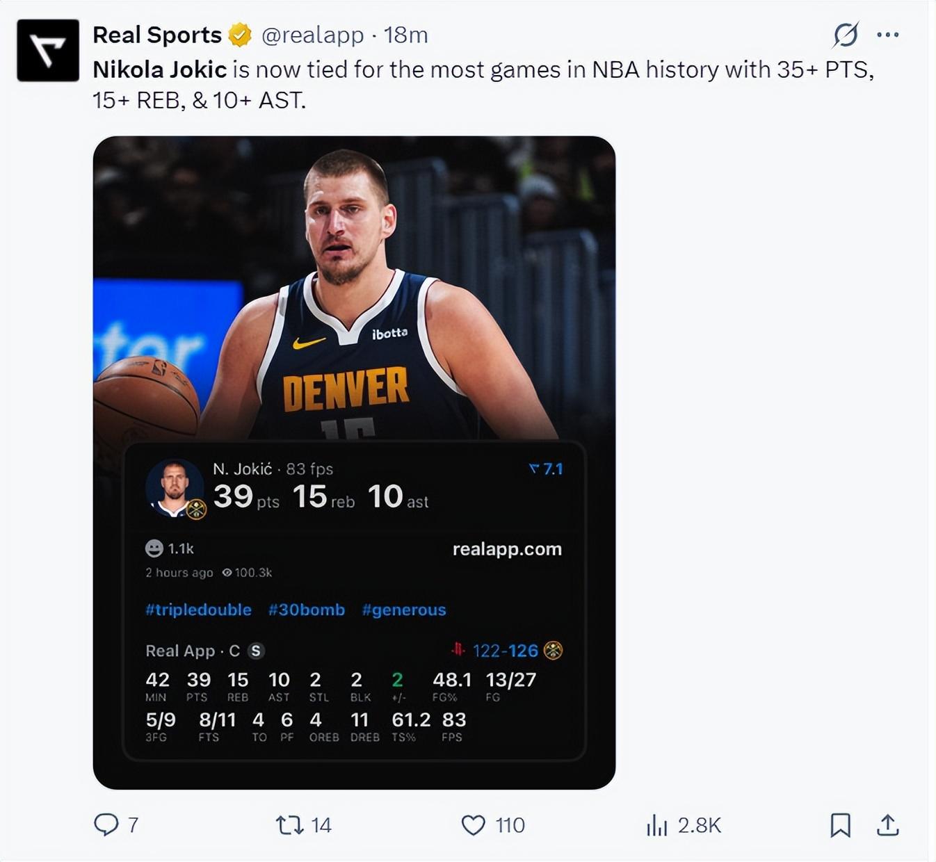 4.約基奇拿到第13次單場35+15+10與大O並列第一;