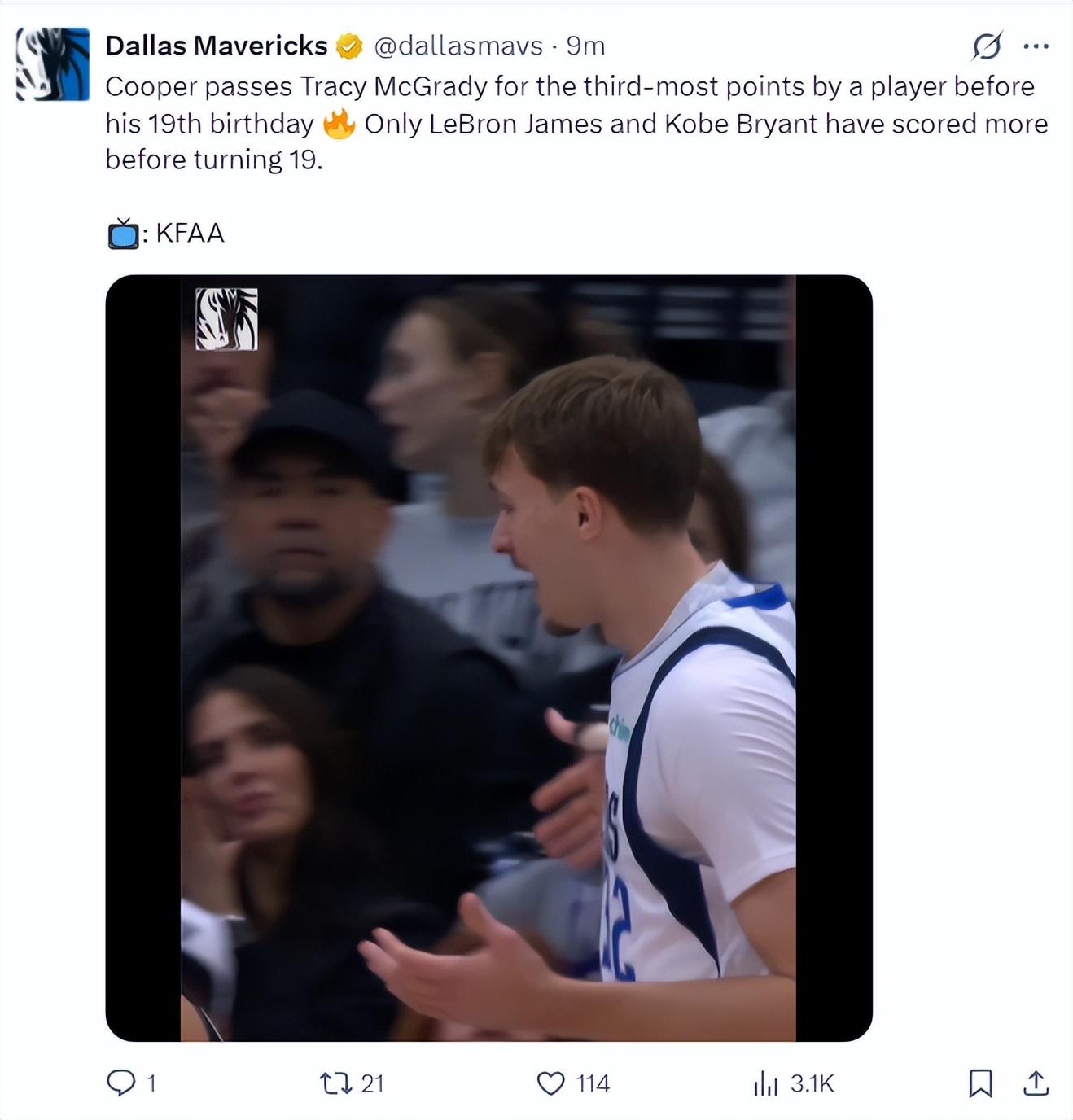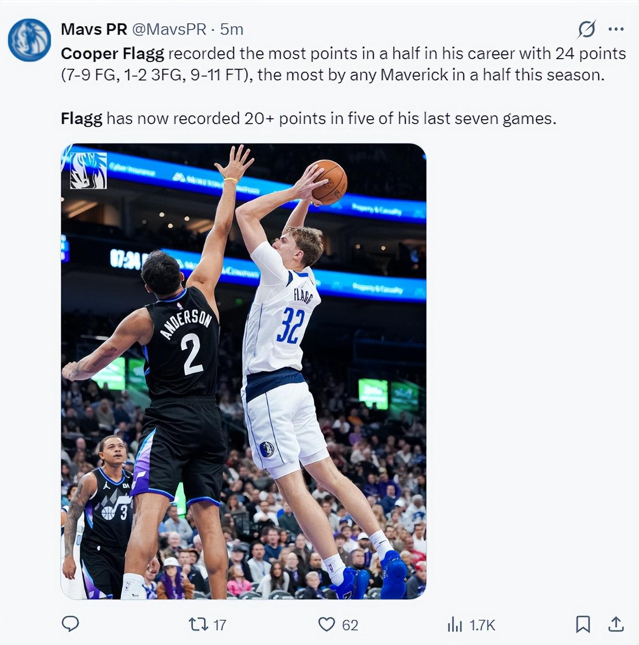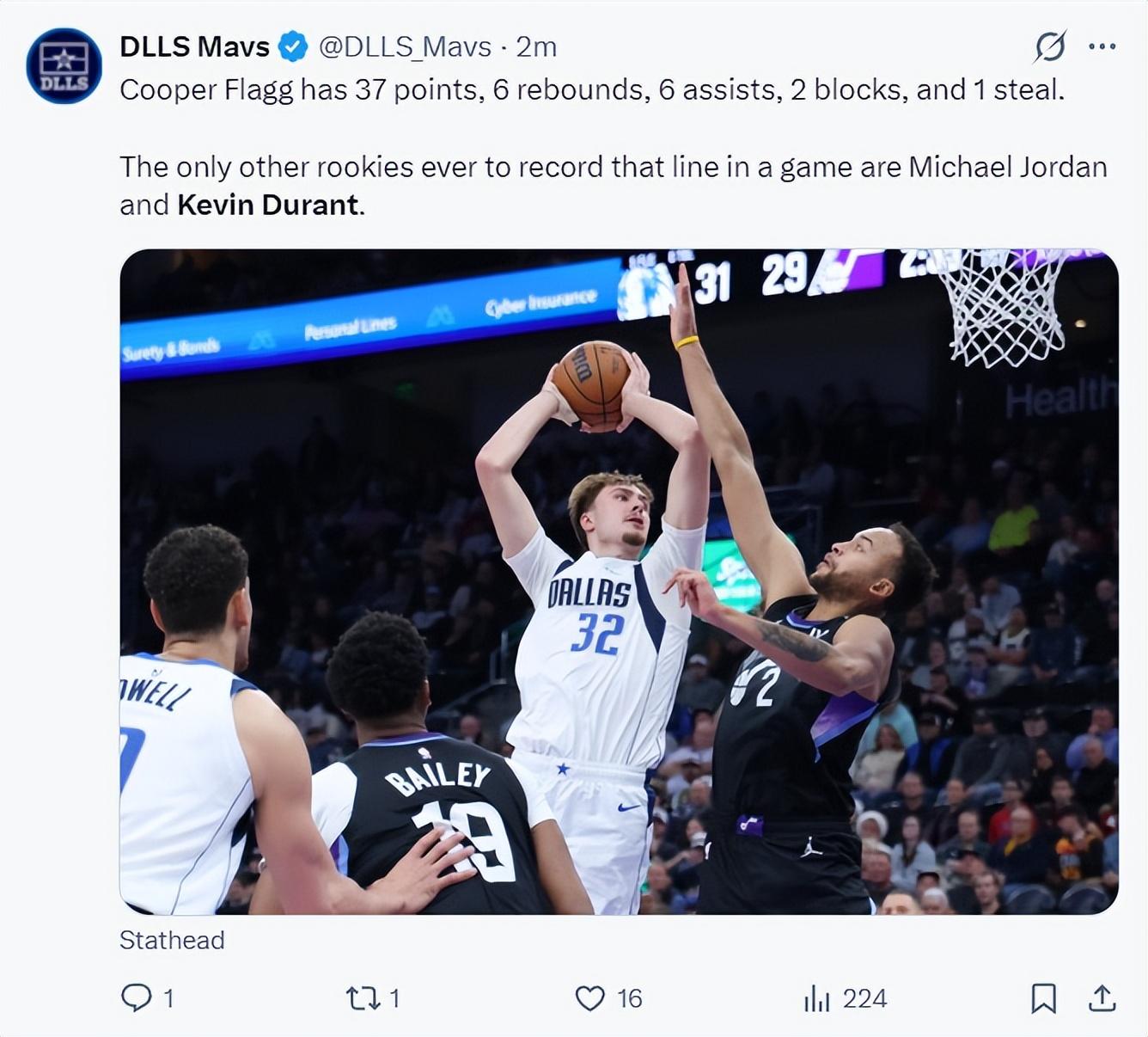 達拉斯媒體,在一場比賽中拿到至少37分6籃板6助攻1搶斷的新秀,除了弗拉格外只有杜蘭特、喬丹。