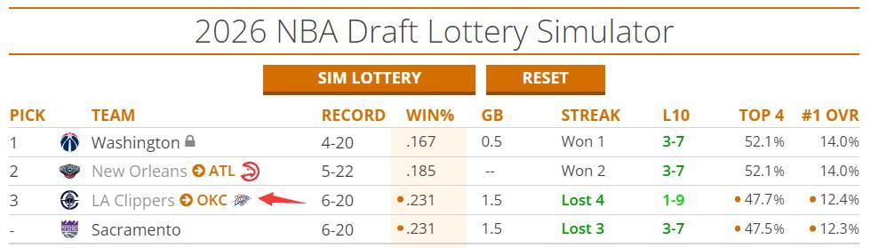 快船隊的狀元籤概率已經提升到12.4%,前四順位概率高達47.7%,這兩項都是聯盟第三高的,因爲快船的戰績是聯盟倒數第三,很慘烈的是2026年快船首輪簽在雷霆,換言之明年夏天雷霆還可能得到一個狀元,諷刺吧?