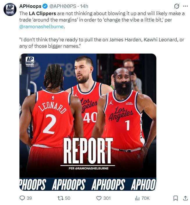 賽後,洛杉磯記者蕾夢娜-謝爾伯恩透露,快船本賽季不太可能交易哈登、倫納德,球隊致力於小修補陣容改變更衣室的情況。(結果快船就用這場比賽打了她的臉,就這更衣室情況能改善?)