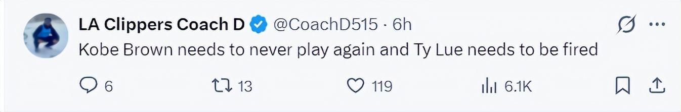 快船媒體LA Clippers Coach D寫道:科比-布朗根本就不該獲得登場機會,快船應該解僱泰倫盧。