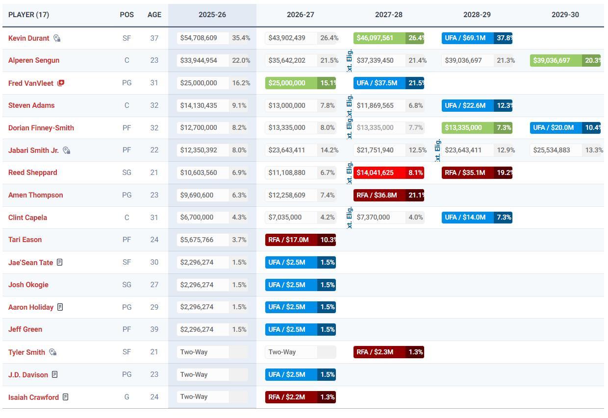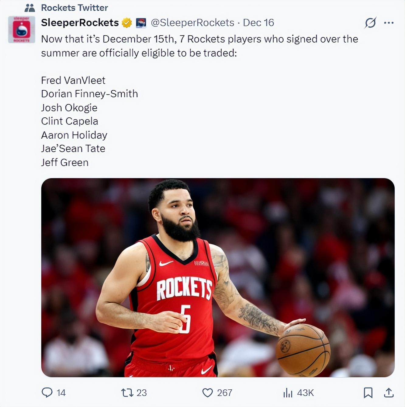 在12月16日後,今夏跟火箭隊簽下合同的7位球員已經解開了交易限制:範弗利特、芬尼史密斯、奧科吉、卡佩拉、霍勒迪、泰特、傑夫-格林。