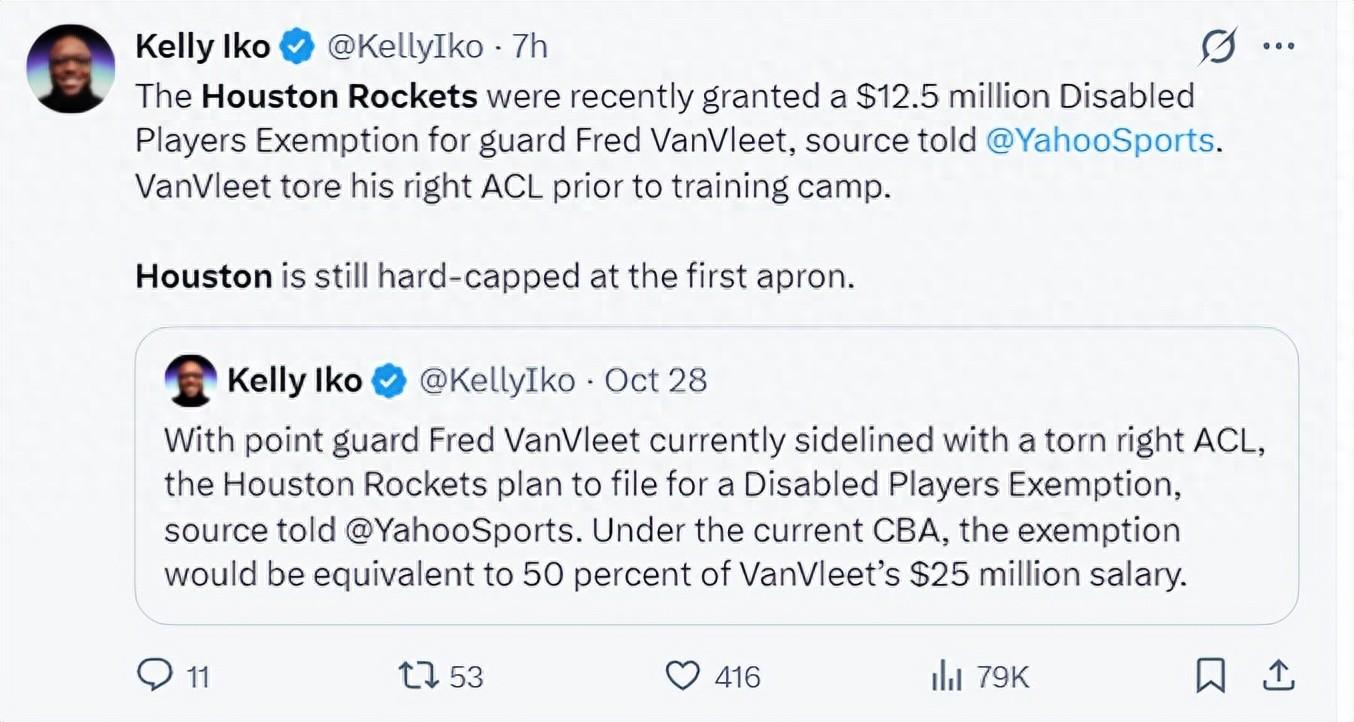 北京時間12月17日,根據火箭雅虎記者凱利-伊科的報道,火箭隊近日因爲範弗利特的賽季報銷申請到了一份價值1250萬的傷病特例。範弗利特因爲在訓練營遭遇了右膝ACL撕裂賽季報銷。