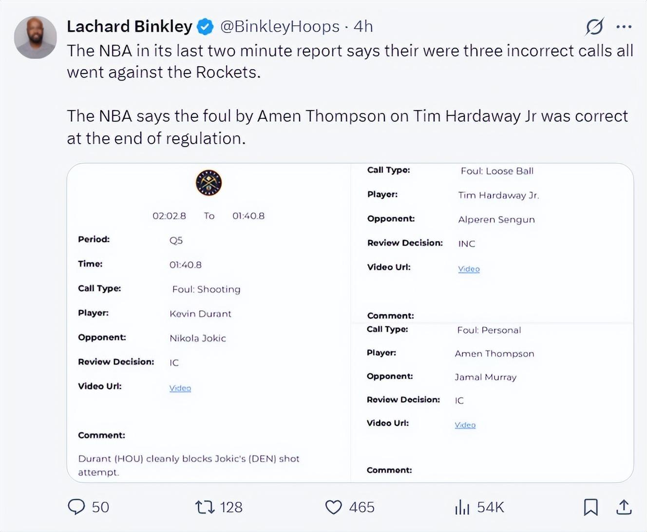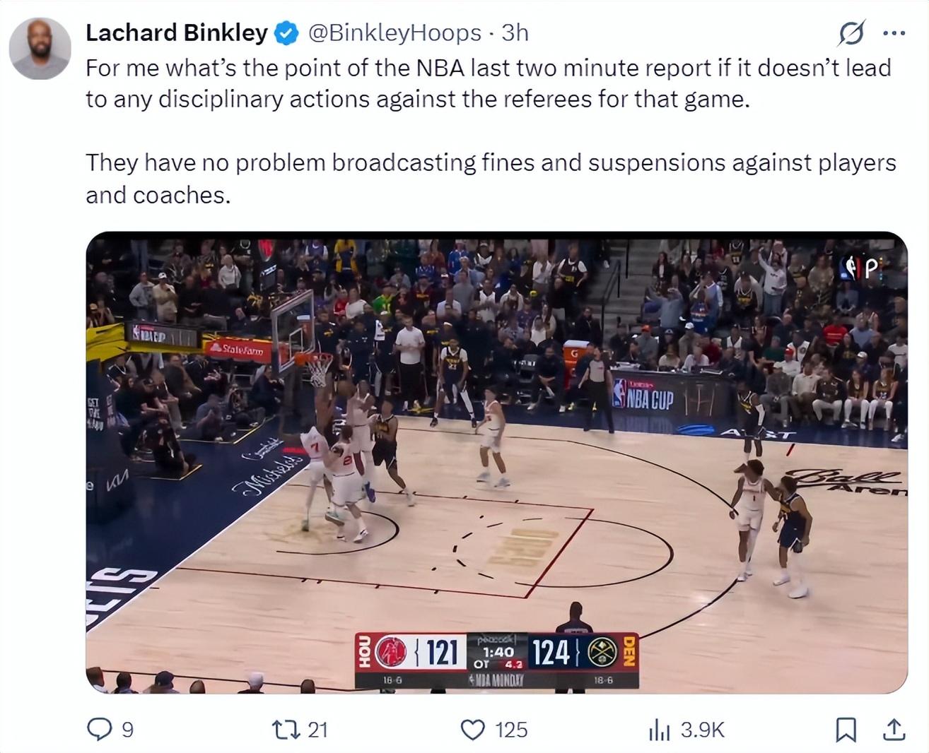 火箭記者蘭德里-賓克利轉發了三次誤判的視頻寫道:請問最後兩分鐘裁判報告有什麼意義?執法裁判出現錯誤沒有任何的處罰手段,但聯盟卻可以毫不避諱的對教練、球員進行罰款與禁賽,這合理嗎?