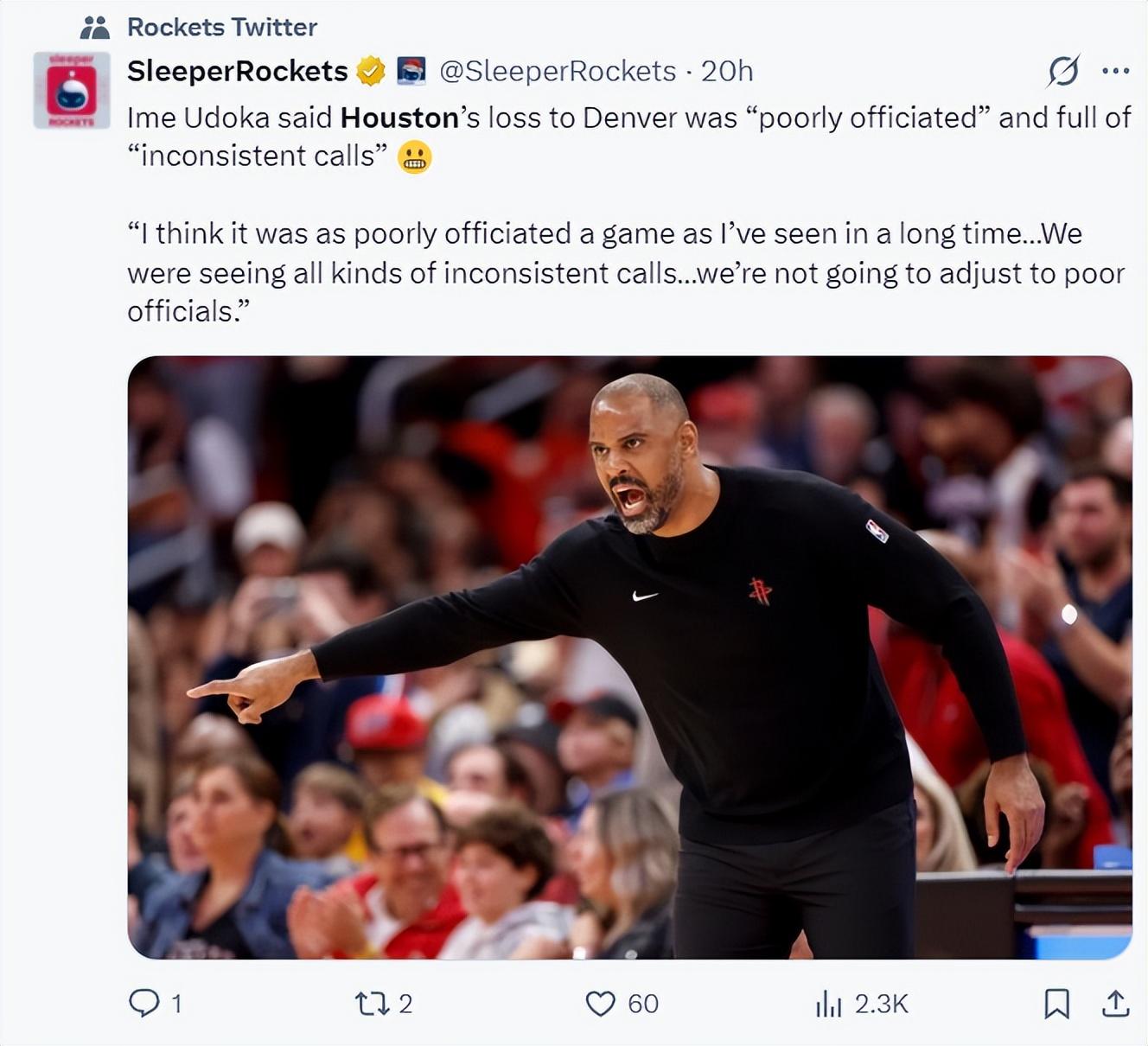 結果比賽最後兩分鐘裁判報告出爐,證明了烏度卡的暴怒是有道理的,不過阿門2.3秒那次絆倒哈達威的確是一個犯規,但這三次誤判/漏判都有利主隊掘金,火箭隊被直接冤死。