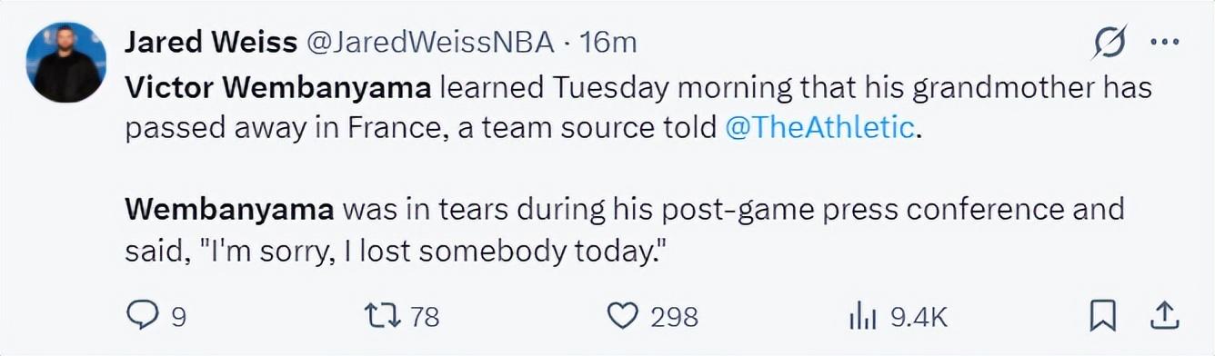 傑德-韋斯報道:在週二早上(盃賽決賽前)文班亞馬得知自己的祖母去世了,在新聞發佈會現場文班亞馬的情緒激動。