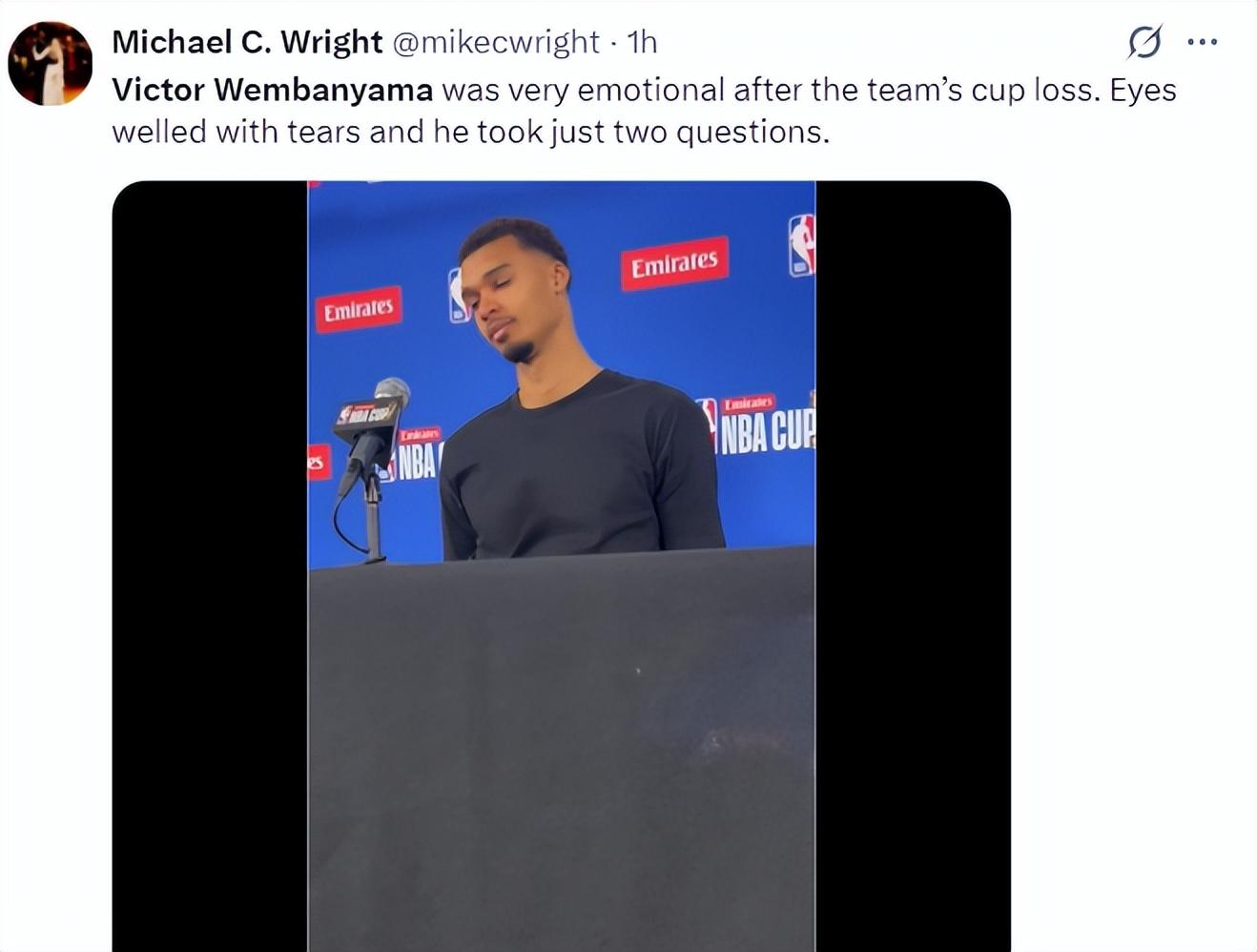 賽後文班亞馬在新聞發佈會現場的痛哭流涕,他說道:今天我失去了一個親人。隨後文班亞馬沉默了,他一直在流淚,文班的鼻子都哭紅了。