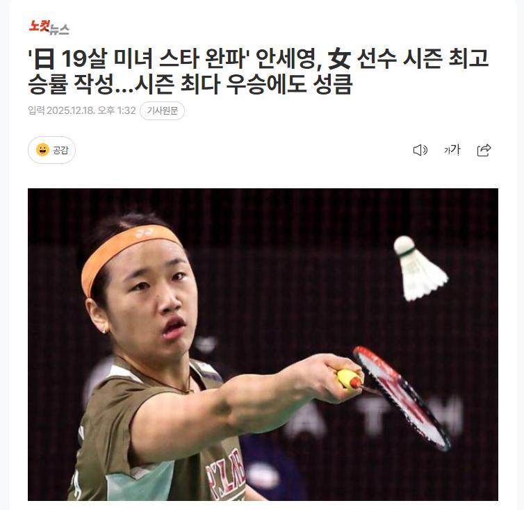 韓媒《世博新聞》寫道:安洗瑩很輕鬆的擊敗了日本19歲的美女明星宮崎友花,她以賽季最高勝率+最多冠軍進入總決賽四強。