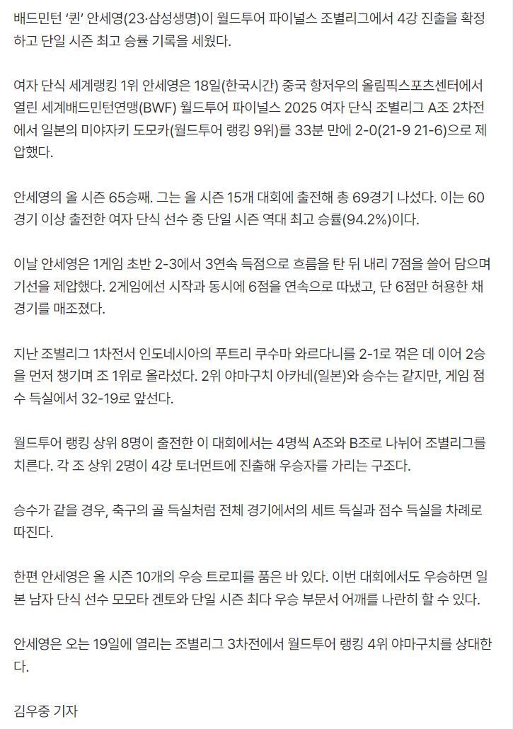 文中寫道:安洗瑩10個冠軍已經追平了自己生涯最多,她距離世界羽壇單賽季最多冠軍11個又近了一步(2019年的桃田賢鬥)。接下來她將與山口茜競爭A組的頭名。