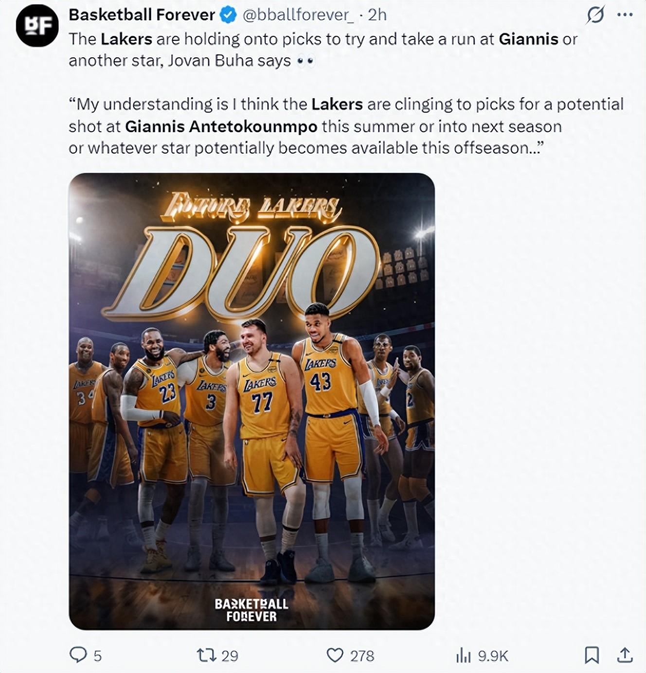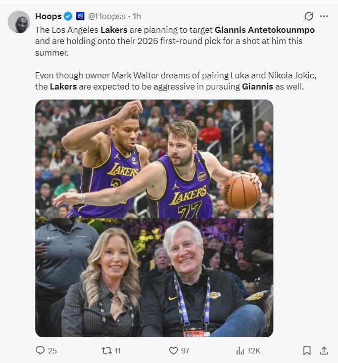 隨後美媒Hoops寫道:雖然湖人老闆馬克-沃爾特最希望的是看到東契奇與約基奇聯手,但預計湖人隊也會嘗試得到揚尼斯。