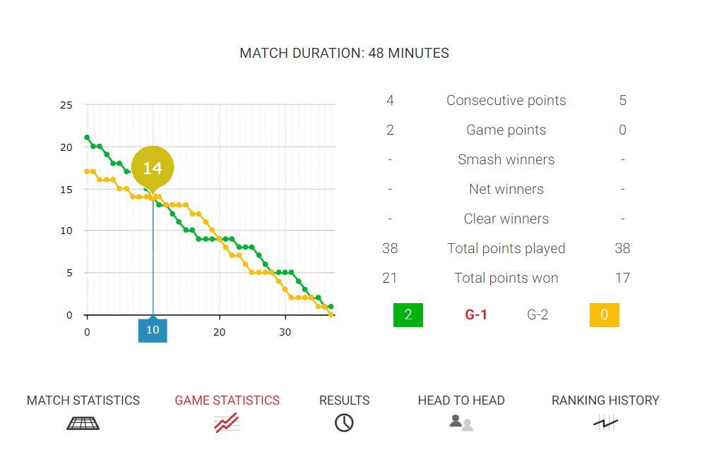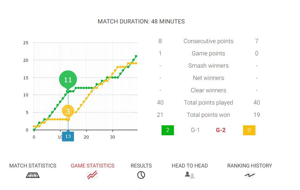 第一局兩人算是拉鋸戰,因達農一度8-5領先,王祉怡又9-7反超,因達農12-10再度反超,進入終局王祉怡17-14又反超,最終21-17拿下第一局。
