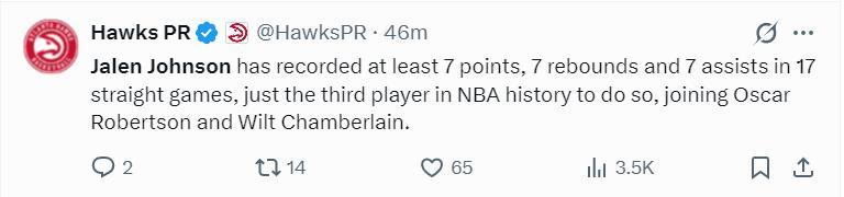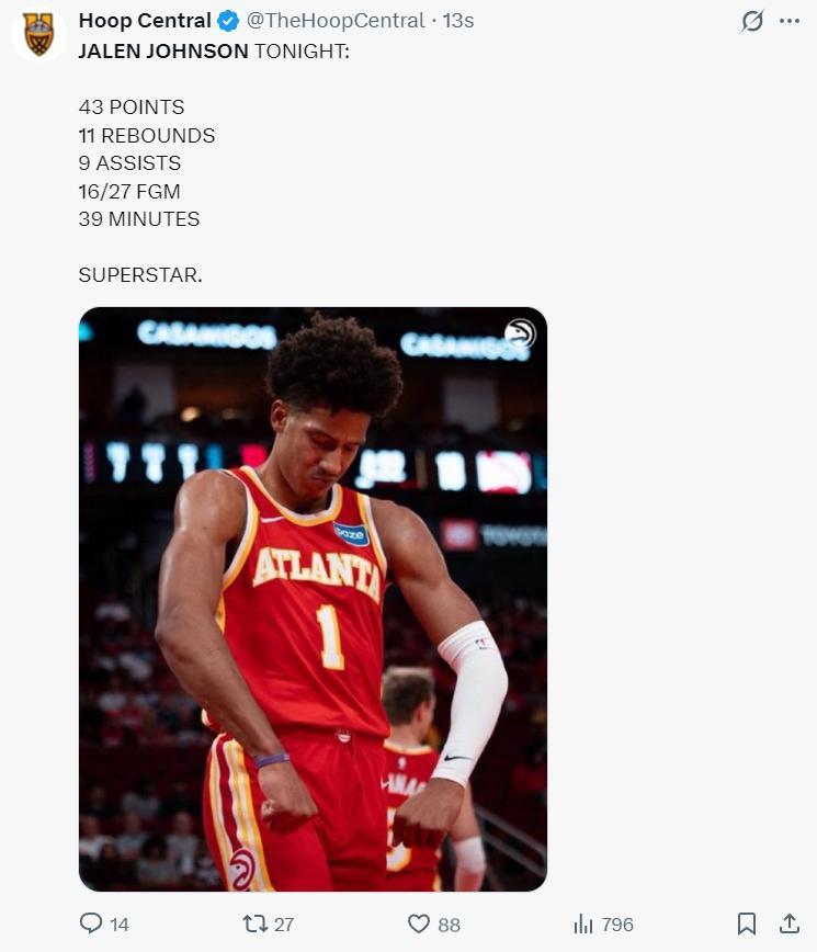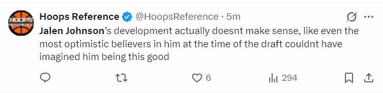 美媒Hoops Reference寫道:杰倫-約翰遜的成長經歷令人驚歎,及時是他選秀時看好他的那些人都不敢想象他能如此的出色。