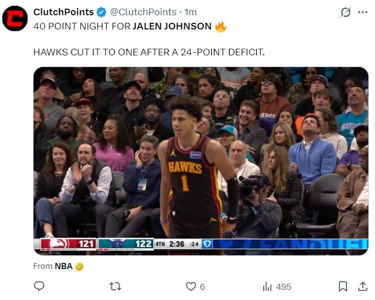 北京時間12月19日,老鷹126-133惜敗黃蜂,這場比賽黃蜂一度領先老鷹24之多,特雷楊的復出並沒有讓老鷹的進攻更好反而在防守端成爲黃蜂提款機,轉折點是特雷楊下場以後,新鷹王傑倫約翰遜帶隊瘋狂追分,末節一度縮小到一分只可惜還是功虧一簣。