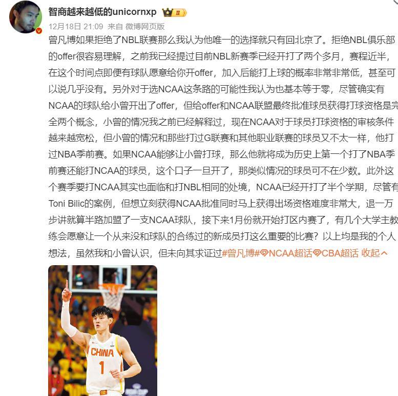 曾凡博去NCAA打球的概率也幾乎爲0,曾凡博是打過NBA季前賽的球員,如果NCAA讓一個打過NBA季前賽的球員重返大學打球,一旦這個口子開了,那麼更多的美國球員就會效仿,明顯不太可能。