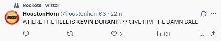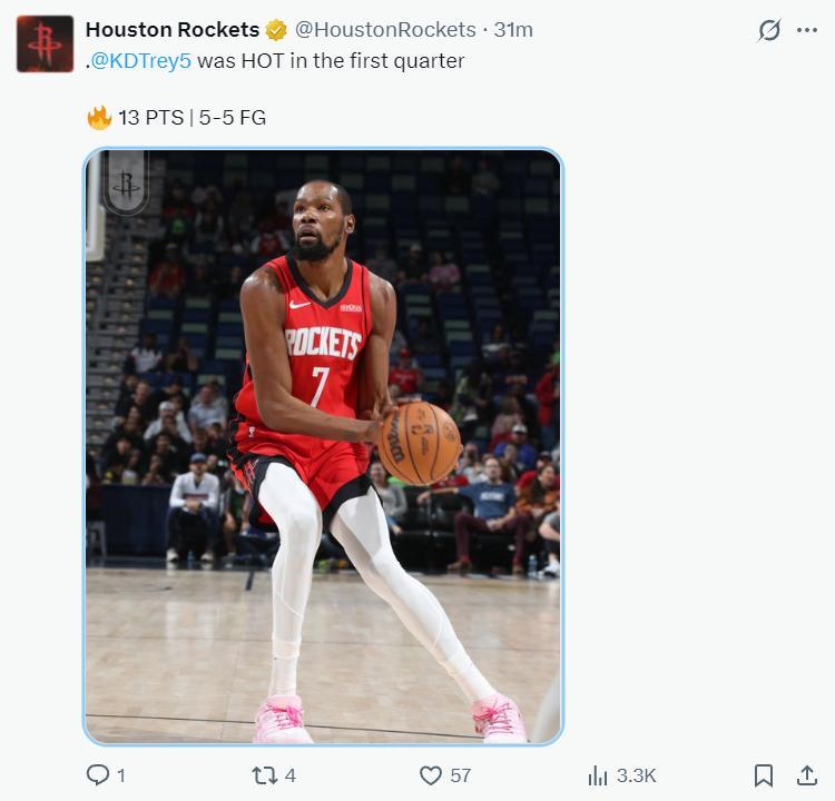 易邊再戰,杜蘭特的進攻慾望非常低,他還是在讓渡球權,申京這一節單節拿到12分,杜蘭特的防守慾望都在下滑,火箭全隊都不怎麼設防感覺比賽已經贏球了,杜蘭特2中0拿0分1籃板1助攻1搶斷,得分還是上半場的18分。